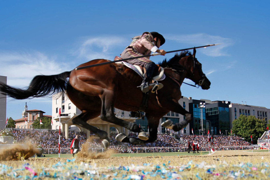 Ogni fantino, in sella al proprio cavallo, cerca di infilare con la sua lancia l’anello appeso alla statua della