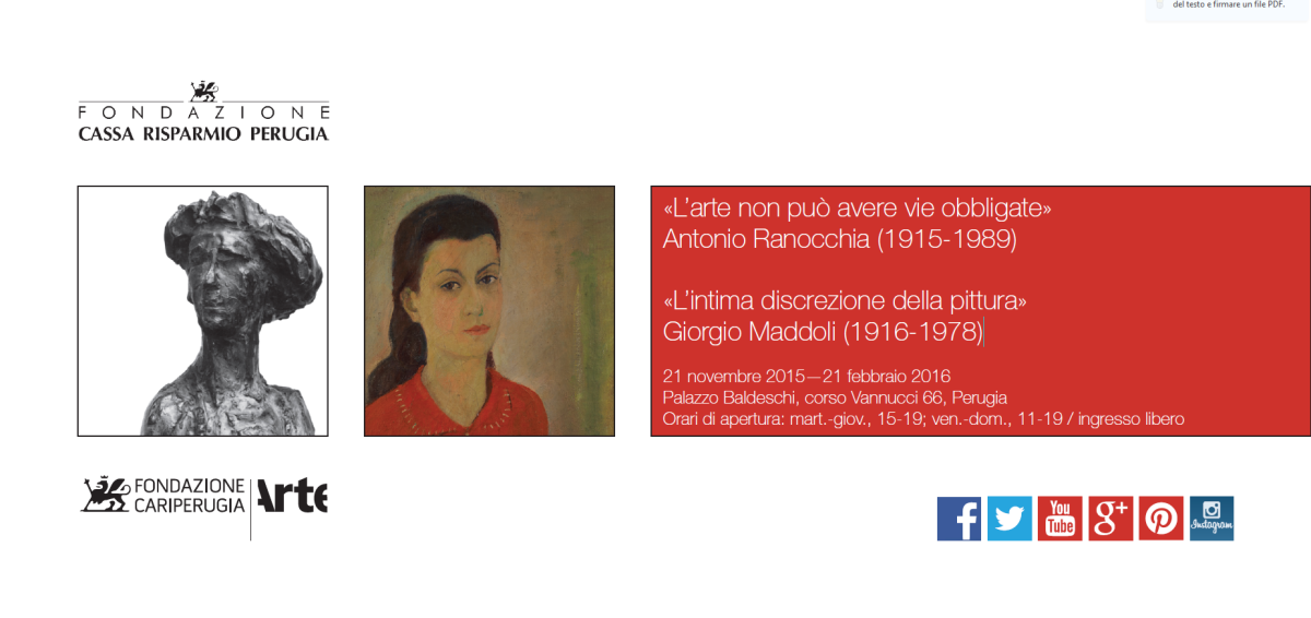 | Nella splendida cornice del piano nobile di Palazzo Baldeschi di Perugia, sono state inaugurate due mostre dedicate ad Antonio Ranocchia e a Giorgio Maddoli, protagonisti dell'arte umbra della seconda metà del Novecento. |