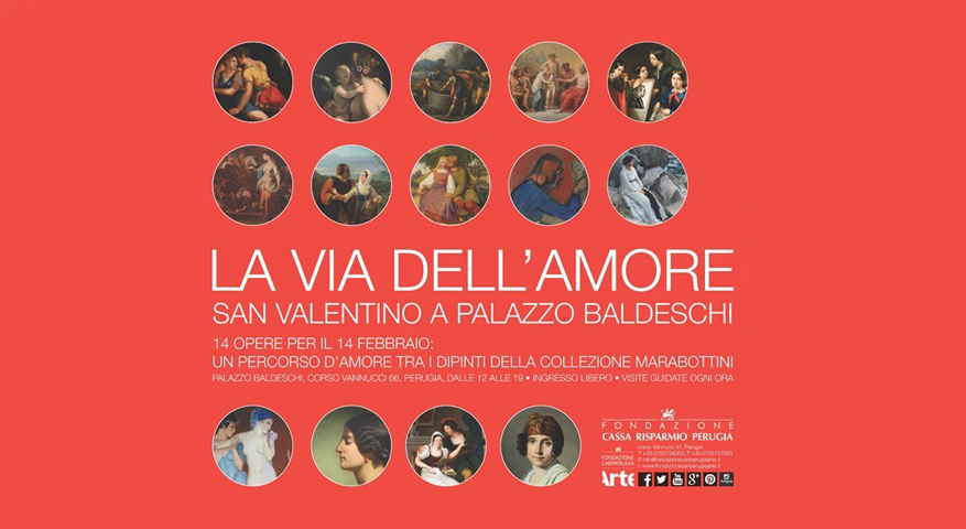 Per l'occasione presso il Museo Marabottini allestito a Palazzo Baldeschi a Perugia, sarĂ possibile fare un viaggio lungo "La Via dell'Amore": un percorso attraverso 14 opere appositamente selezionate ti porterĂ alla scoperta dell'amore in ogni sua forma, da quello della madre per il figlio a quello verso la propria donna, da quello raffigurato nella mitologia a quello legato agli eventi storici.