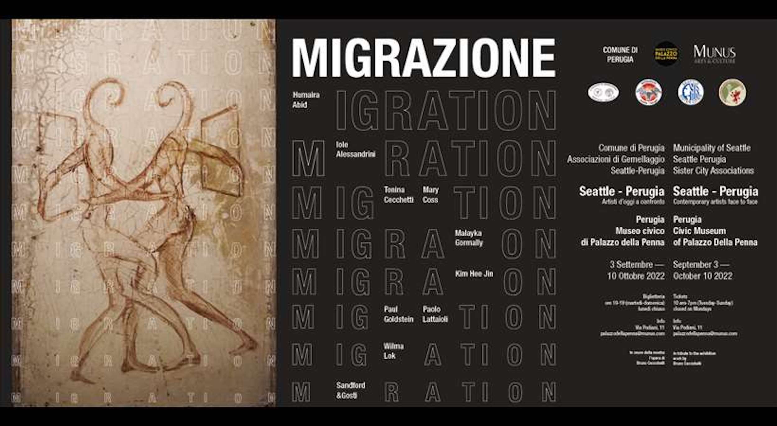 Dal 3 Settembre fino al 9 Ottobre, il Museo Civico di Palazzo della Penna, a Perugia, accoglie la mostra Migrazione/Migration. Seattle-Perugia, artisti d’oggi a confronto.