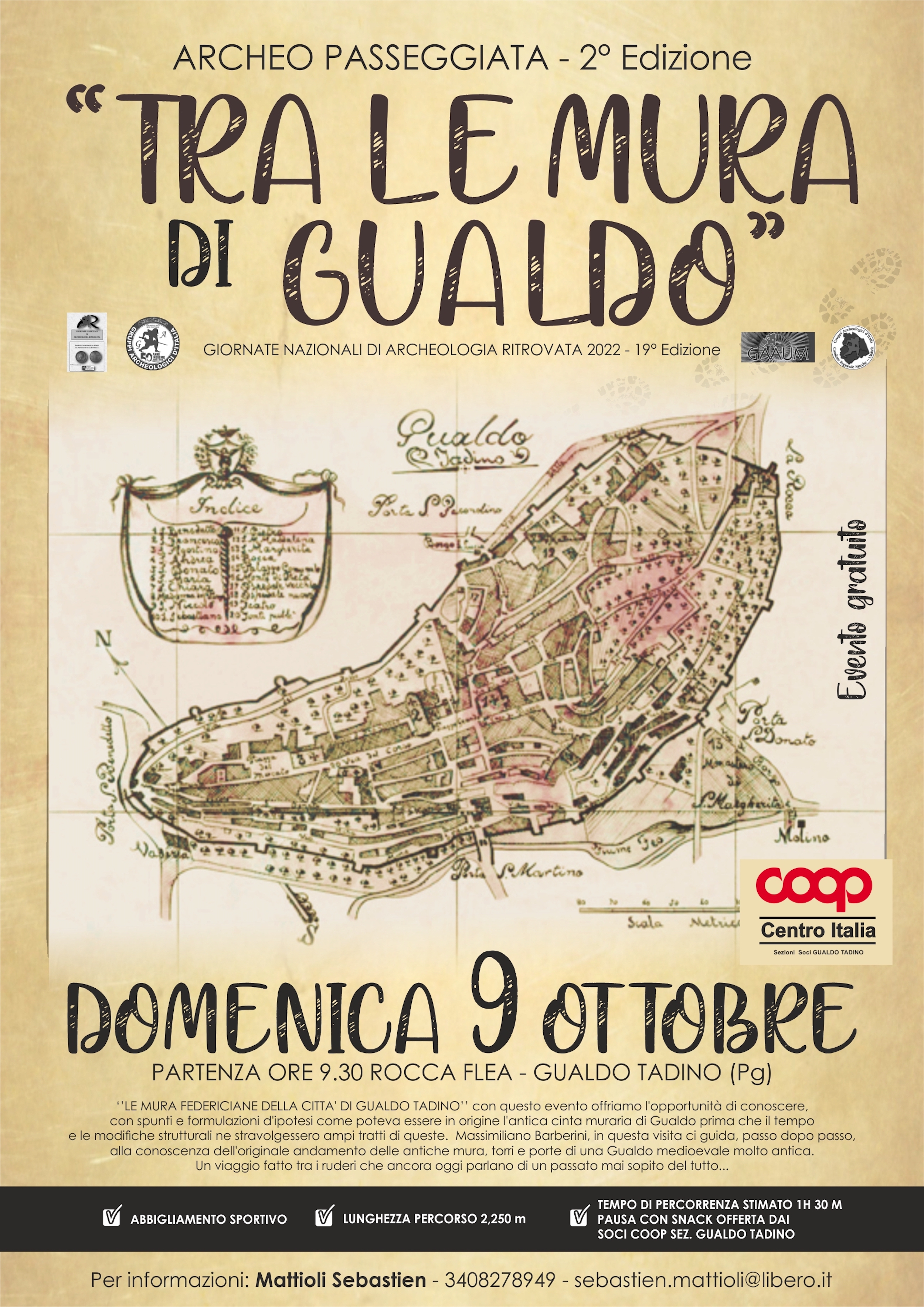 L’evento è gratuito. La lunghezza del tracciato è 2 km e 250 metri. Si consiglia abbigliamento sportivo in quanto sono tutte strade asfaltate o pavimentate. Il tempo di percorrenza, con sosta esplicativa e pausa snack offerta dal Comitato Soci Coop di Gualdo Tadino, è stimato in 1h 30min.