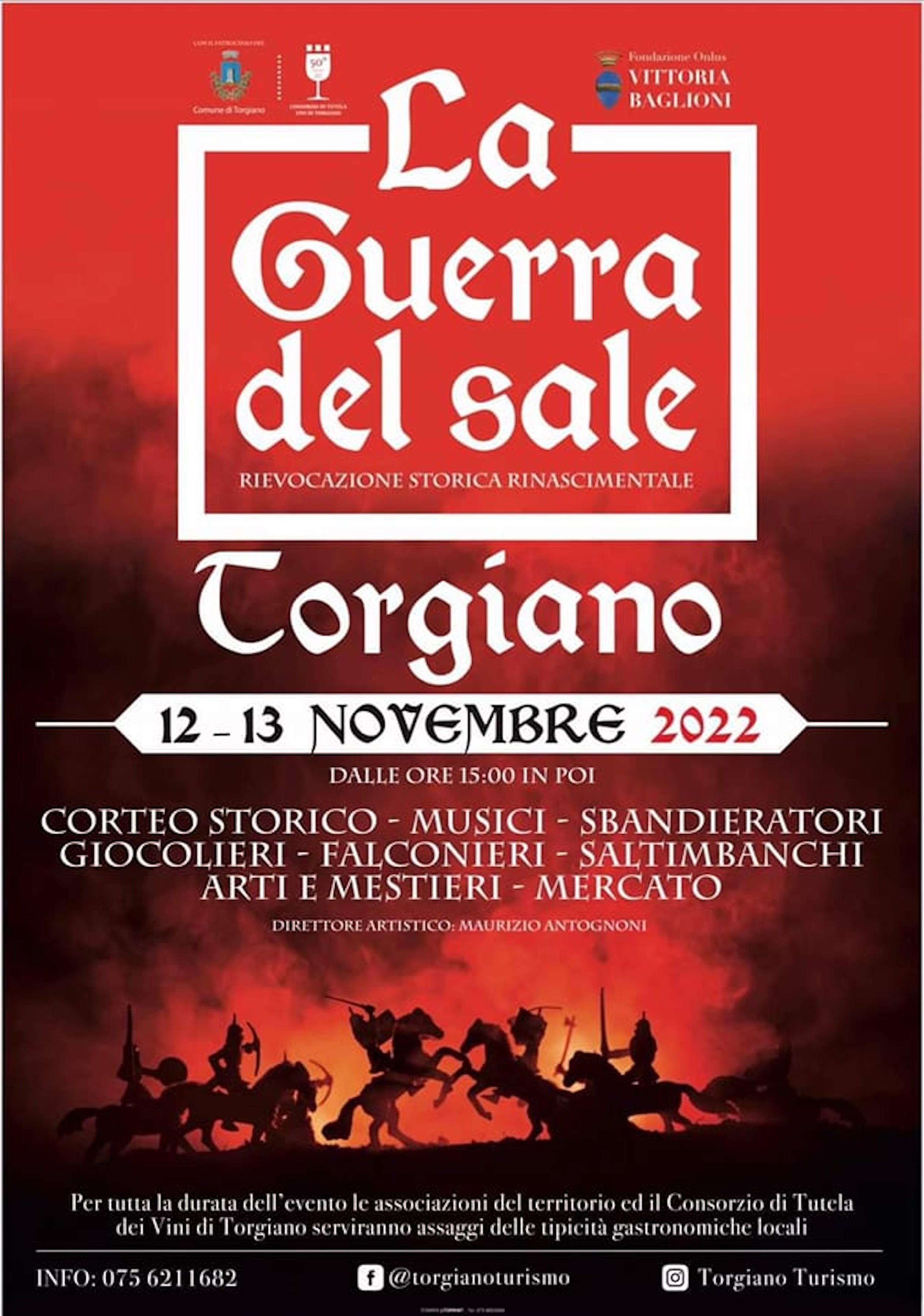 Dal 12 al 13 Novembre torna uno degli eventi più attesi e partecipati di Torgiano, La Guerra del sale, una straordinaria rievocazione storica che ricorda la lunga resistenza dei cittadini, durante lo scontro tra le coalizioni di Perugia e del Papato.